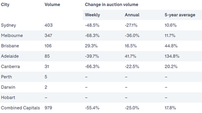 According to Domain’s latest data, there will be a total of 979 auctions taking place in all eight capitals, which represents a week-on-week fall of 55.4 per cent.